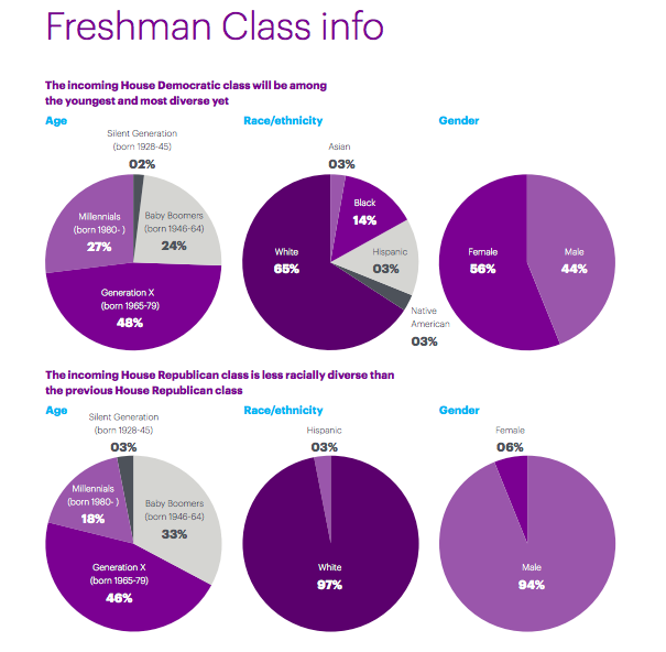 The freshman class is made up of 11 newly elected (or appointed) Senators (3 Dem, 8 GOP) and 100 newly elected House members (63 Dem, 37 GOP). The following infographic is pulled from the Dentons 2019 US Policy Scan. Yes, this is a shameless plug for the Dentons Public Policy Group but its a comprehensive, 100-page (sheesh) preview. You can read the whole thing here: https://www.dentons.com/en/insights/guides-reports-and-whitepapers/2019/january/3/us-policy-scan-2019