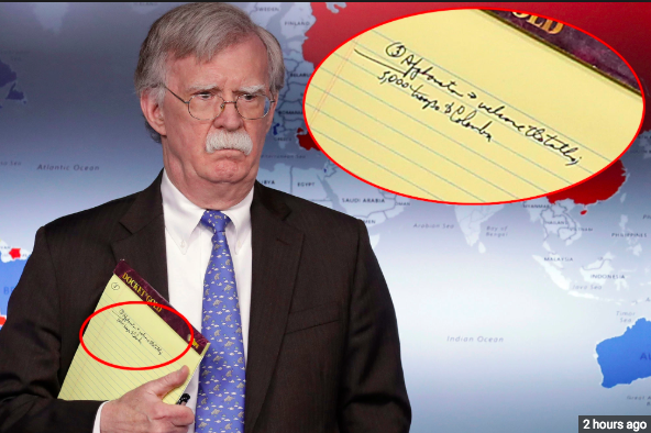 When asked about possibly military action in the country Chief of Staff Mick Mulvaney did not rule it out. Adding to speculation, John Bolton was photographed with a notepad in hand, upon which seems to be a note that reads “5,000 troops to Colombia,”.
